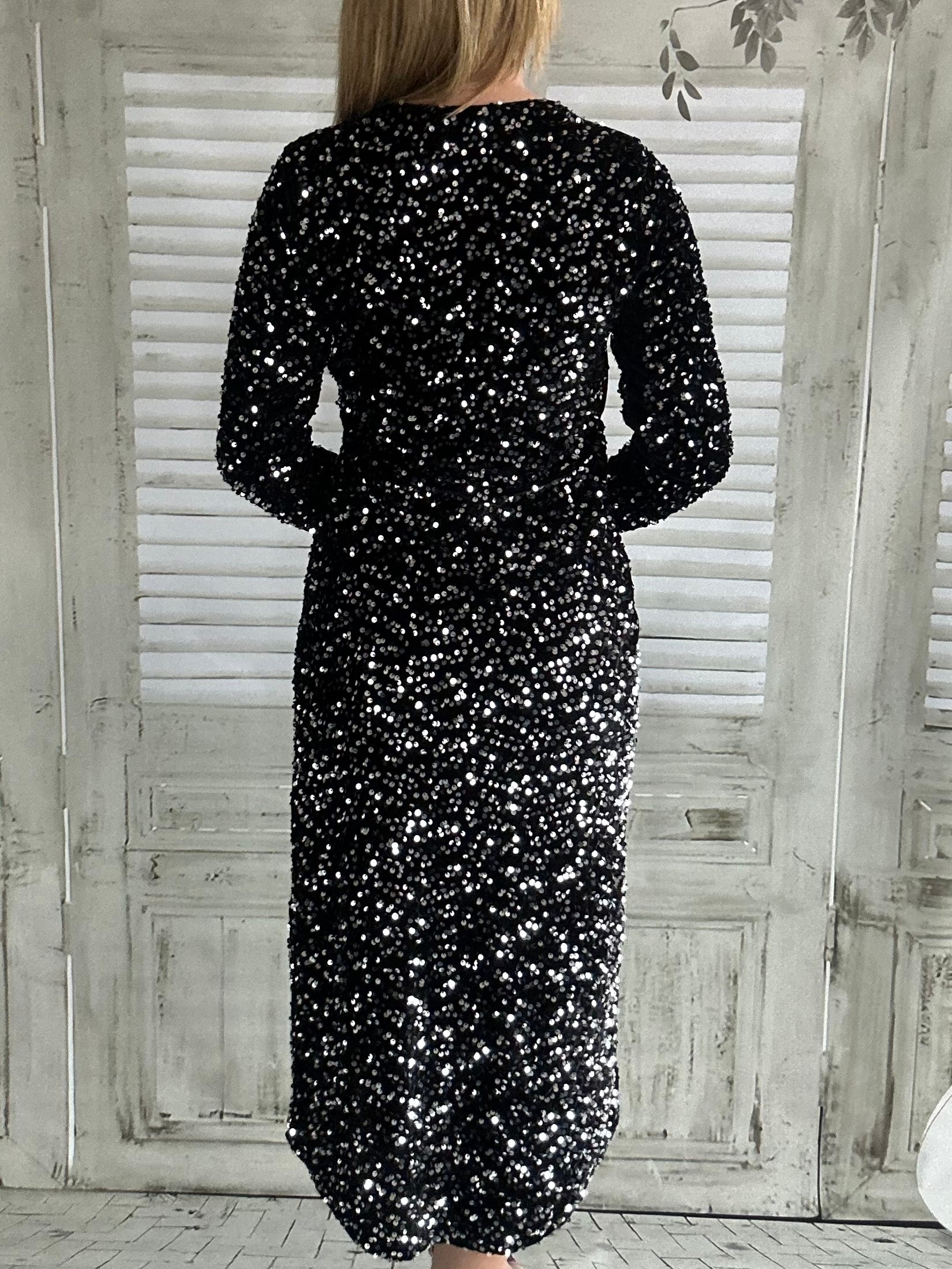 Audacieuse et éclatante, la robe Mia attire tous les regards par son jeu de lumière et sa coupe flatteuse. Entièrement ornée de sequins noirs aux reflets argentés, elle scintille avec élégance à chaque mouvement. Son décolleté croisé met subtilement en valeur le buste, tandis que la jupe portefeuille allonge la silhouette avec une touche de modernité. Les manches longues équilibrent l’ensemble et apportent une note chic et intemporelle.